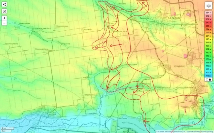 Западнее Селидово, мы начали бои за н.п. Пустынка, который расположен чуть северо-западнее ранее освобожденной Юрьевки. Занятие данного рубежа позволит нам подтянуть фланг клина, который мы ранее вбили в районе южнее Новоалексеевки. Чтобы таким образом подготовить условия для дальнейшего движения здесь вперед.