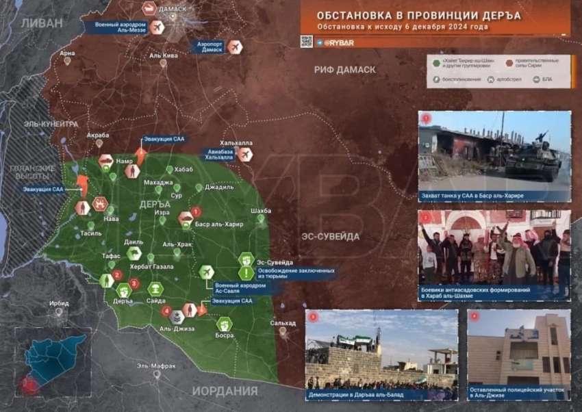 В последние дни оппозиционные формирования достигли значительных успехов, закрепившись в районах, ранее считавшихся твердынями правительства. Группировки, действующие под координацией «Южной оперативной комнаты», уже взяли под контроль несколько ключевых объектов на пути к Дамаску. Среди них военные склады и транспортные узлы, обеспечивающие снабжение армии, информирует Avia.pro.