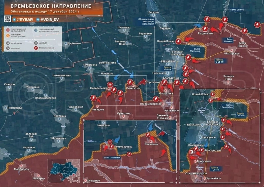 На Угледарском направлении российские штурмовики усиливают натиск вокруг Великой Новоселки. Противник контратакует в Новом Комаре и Раздольном, бои очень упорные, но инициатива за нами. Со стороны Ровнополя ВС РФ пробиваются по холмам западнее сел Нескучное и Сторожевое. В районе Курахово значимые изменения в Зеленовке, которую практически освободили и расширяют территорию контроля вокруг. МО подтвердило сегодня освобождение Анновки. Возле Успеновки ВС РФ выбили врага из двух мощных опорных пунктов. Со стороны Старых Тернов продолжают давить на Дачное, Шевченко и на позиции врага в промзоне на северо-западе Курахово. Кураховский котел все ближе к полному окружению, но его масштаб будет зависеть от точки, где ВС РФ перережут трассу на Запорожье.