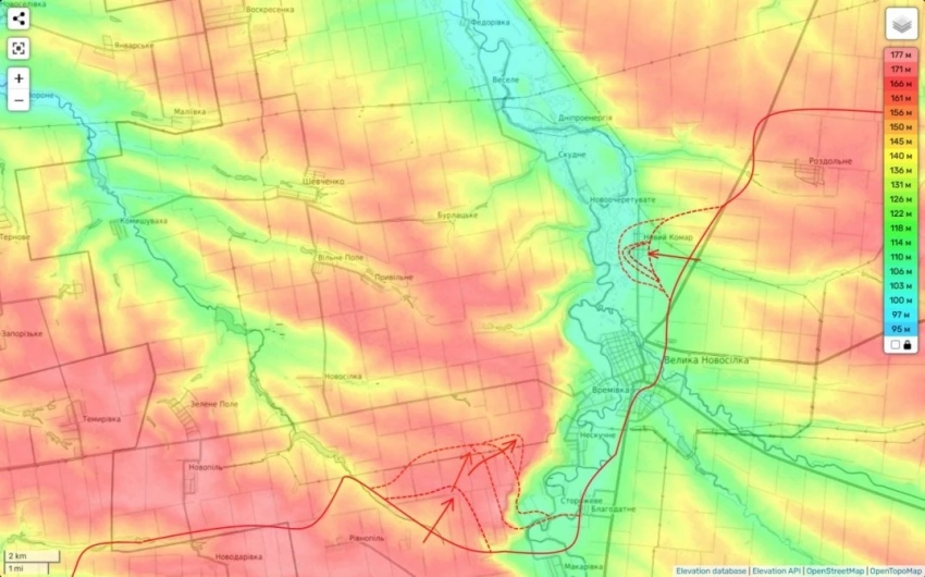 Ситуация севернее выглядит ещё лучше. Там русские войска смогли полностью вернуть под контроль населённый пункт Новый Комар.
