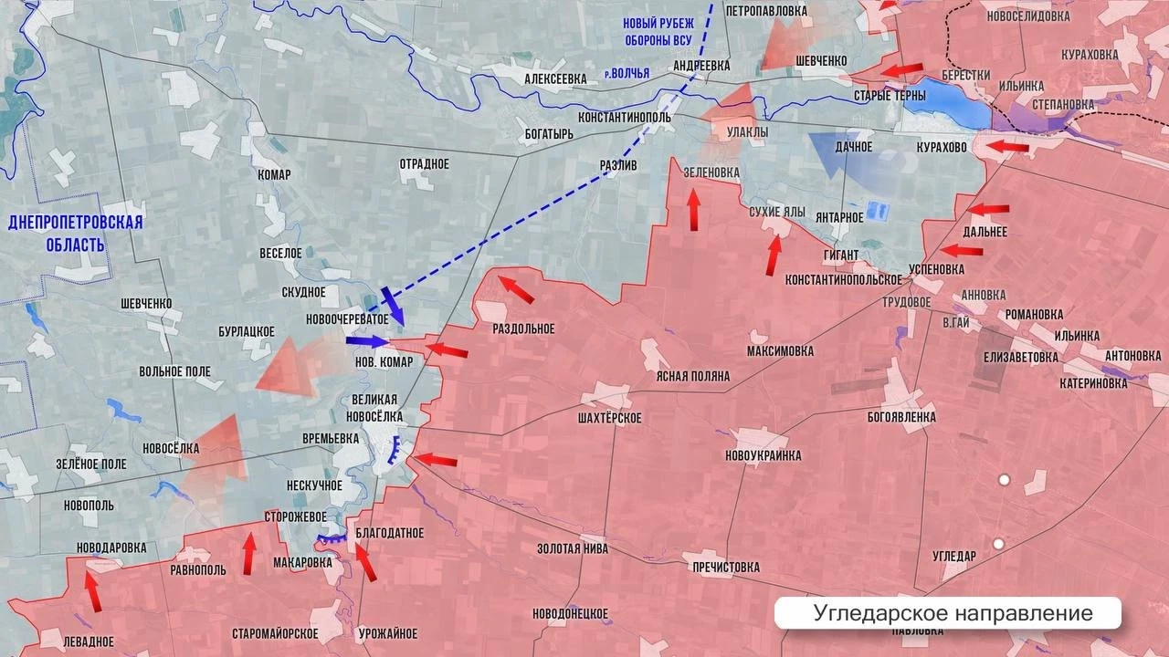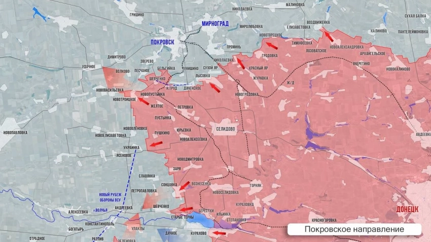 На Покровском фронте интенсивные бои идут вокруг Покровска и Мирнограда. В районе Шевченко ВС РФ усилили натиск на гарнизон ВСУ в Песчаном. Западнее Новотроицкого наши провели неожиданный маневр: вступив в бои за Нововасилевку и закрепившись на ее окраинах, часть наших бойцов форсировала р. Соленая и вошла в Волково, что в 1 км к юго-западу от Песчаного. К западу от Шевченко идут бои в районе Нового Труда, Зеленого и Даченского, где наши пробиваются на север. Вдоль ж/д на Чунишино есть продвижение примерно на 500м. Южнее ожесточенные бои идут по линии сел Нововасилевка-Новооленовка-Украинка-Славянка-Петропавловка.