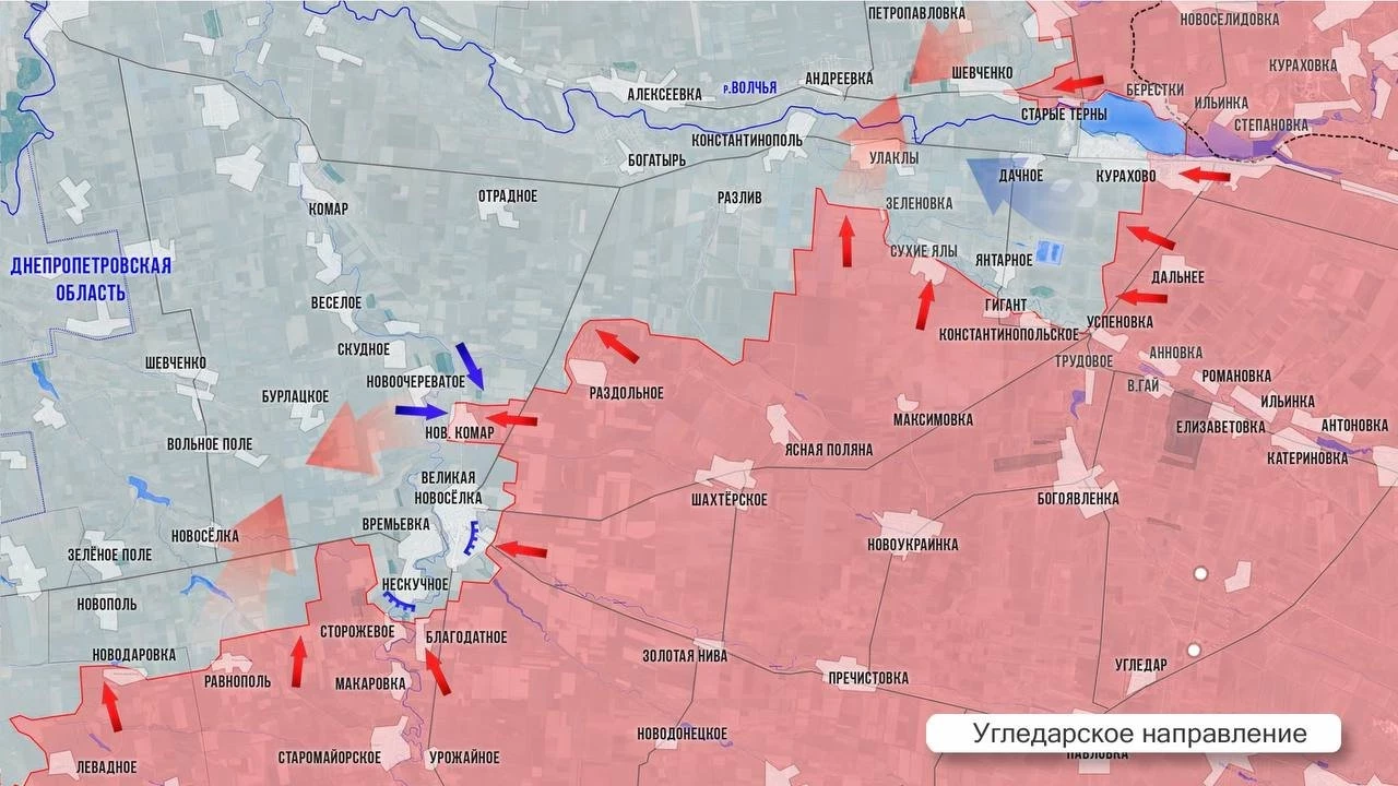 На Угледарском фронте ВС РФ продолжают охват Великой Новосёлки. Наши штурмовики атакуют западнее поселка в сторону Новосёлки, зачистили несколько позиций северо-западнее Нескучного. Нашим военным удалось также немного продвинуться к Разливу. ВС РФ штурмуют Дачное с севера, со стороны Старых Тернов, а также с юга, где наши стараются перерезать дорогу на Янтарное. За само Янтарное идут жестокие бои. От Янтарного до Улаклы ВСУ удерживают правый берег реки. Наши планомерно зачищают Курахово.