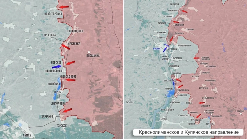 На Купянском направлении ВС РФ атаковали севернее Лозовой с использованием большого количества бронетехники и продвинулись на 3.5 км на рубеже Загрызово - Лозовая. В районе вчера освобождённой Надии, по-русски Надежды, ВС РФ стараются ликвидировать карман и выровнять линию фронта на этом участке.