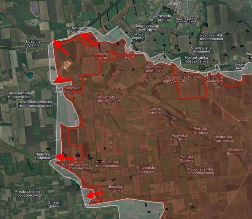 Под контроль российских войск перешла территория от восточной окраины Удачное до западной окраины Котлино на участке шириной до 2.45 км.