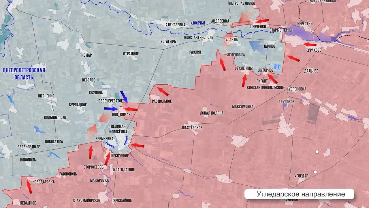 На Угледарском фронте ВС РФ активно продвигаются в районе Великой Новосёлки. До этого наши бойцы взяли за двое суток Нескучное, а МО подтвердило освобождение Времевки. Её наши штурмовали всего сутки, а вчера установили флаг перед мостом через реку Мокрые Ялы. Теперь гарнизон ВСУ в Великой Новосёлке находится в физическом окружении - наши перерезали все пути сообщения, а узкий коридор через лесополосы на северо-западе находится под огневым контролем. По последним данным, ВС РФ штурмуют Великую Новосёлку не только с севера и юга, но и с востока, а ВСУ отошли за р.Кашлагач. В Кураховском кармане армия России вытесняет ВСУ с северного берега р.Сухие Ялы. Наши закрепились на восточной окраине Дачного, и вместо штурма развивают наступление на юг от села. Под контроль наших войск перешел опорный пункт западнее Янтарного.