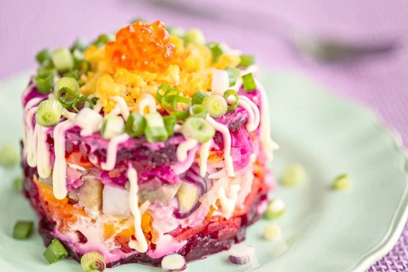 Традиционно слои должны быть уложены в следующем порядке: картофель, морковь, яйца, селедка и свекла. При этом важно, чтобы салат немного «отдохнул» в холодильнике перед подачей, минимум час — так все слои хорошо пропитаются и станут еще более вкусными.